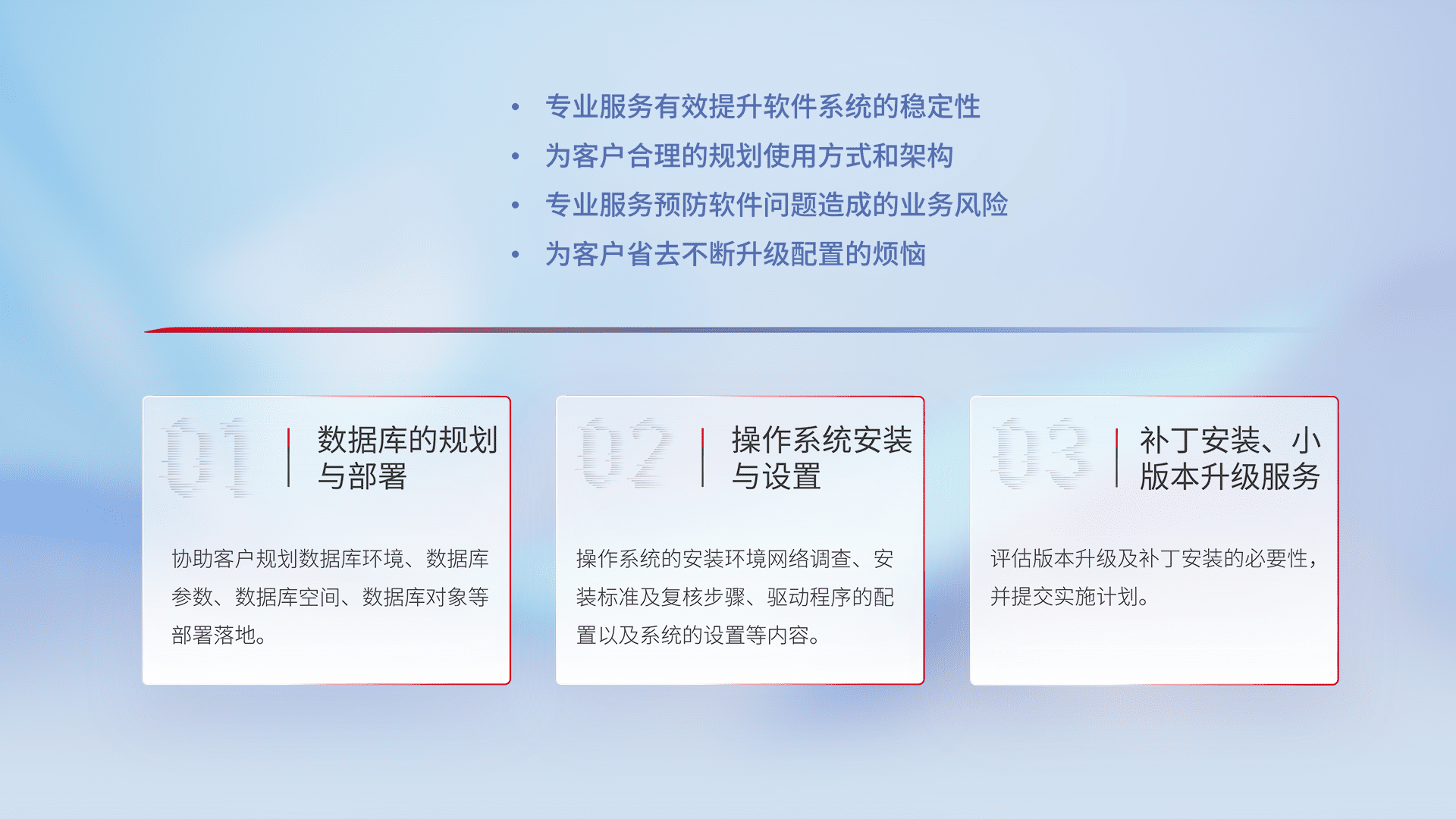 为客户提供软件规模升级、、快速部署、、按需配置的专业服务,,,从数据库的规划与部署到操作系统的安装与设置,,,,再到补丁安装和小版本升级提供支持。。。。