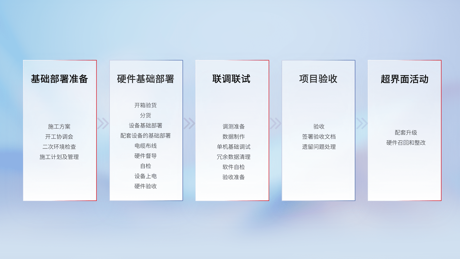 从基础部署准备、、、、硬件基础部署、、联调联试、、、、项目验收、、越界面活动的全过程可追溯,,,保证施工质量和进度。。